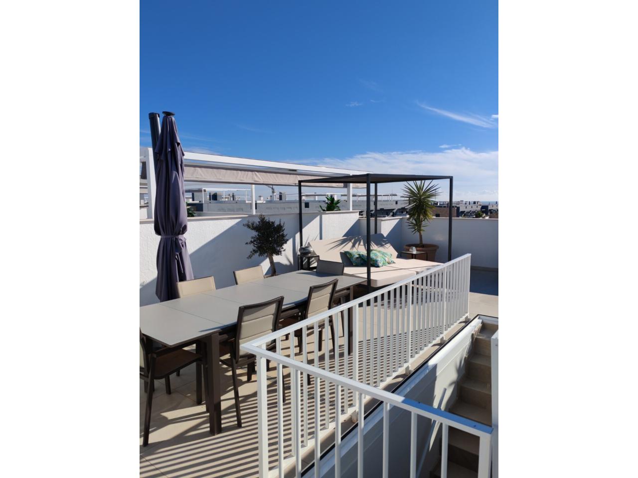Destaca su amplia terraza con toldo y un solárium privado desde donde se disfrutan impresionantes vistas panorámicas al mar y a Orihuela Costa, ideales para relajarse o disfrutar de reuniones al aire libre.