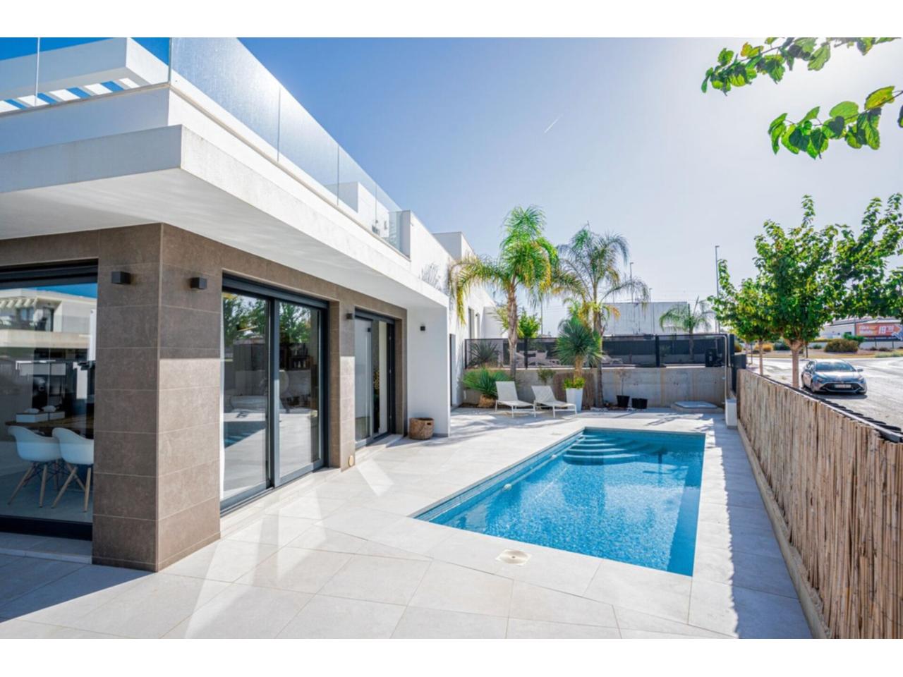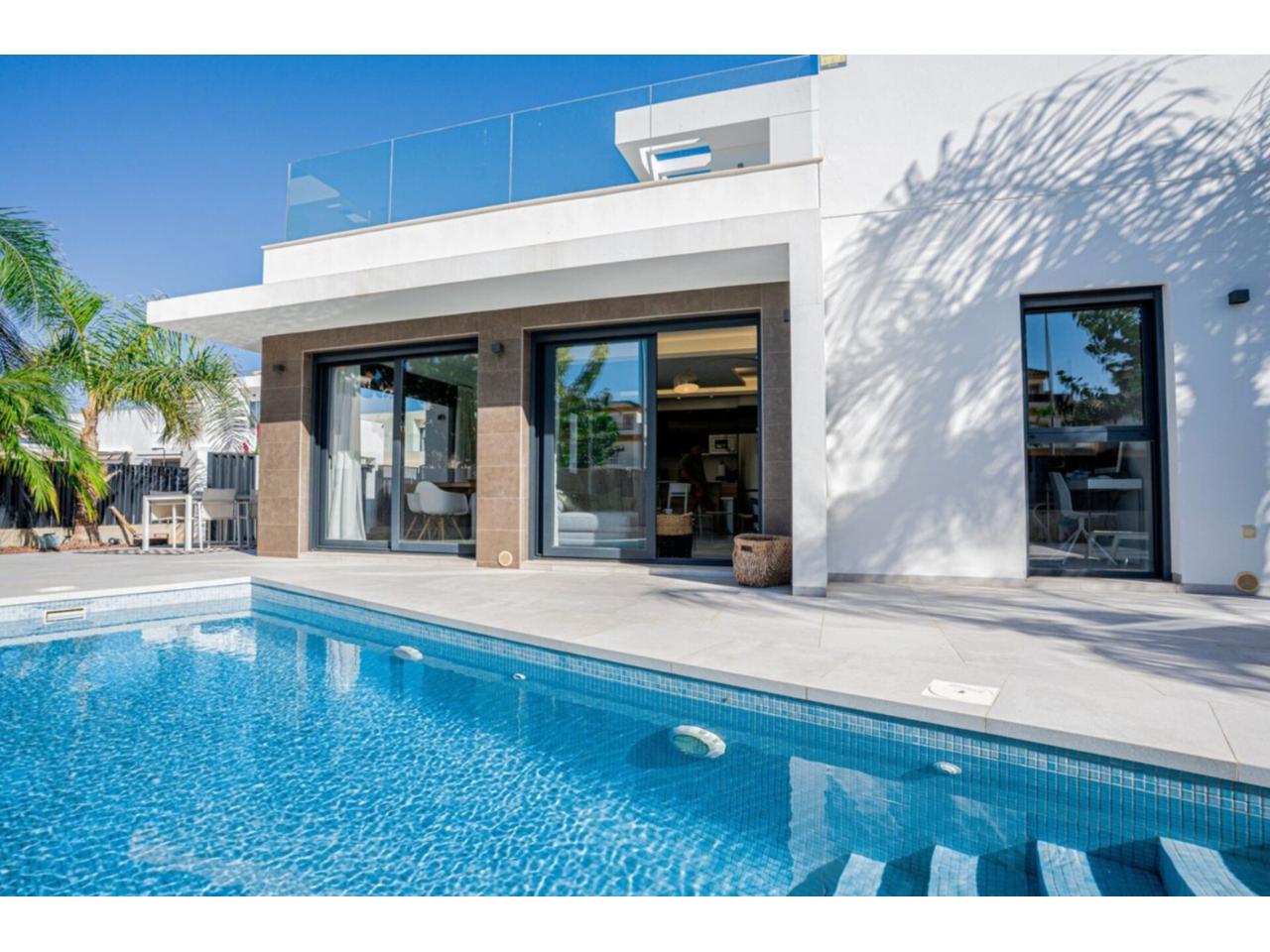 Villa moderna para familias y profesionales exigentes: Descubra una soleada villa de 120 m² (en una espaciosa parcela de 306 m²) diseñada para quienes valoran la privacidad, el confort de vanguardia y una calidad de vida excepcional. Esta casa cuenta con tres acogedores dormitorios y dos elegantes baños, que ofrecen espacio tanto para la relajación como para la comodidad diaria. La impresionante terraza de 62 m² y la piscina de aguas cristalinas crean un salón de verano ideal, mientras que todas las ventanas están equipadas con persianas eléctricas para una comodidad y seguridad inigualables.